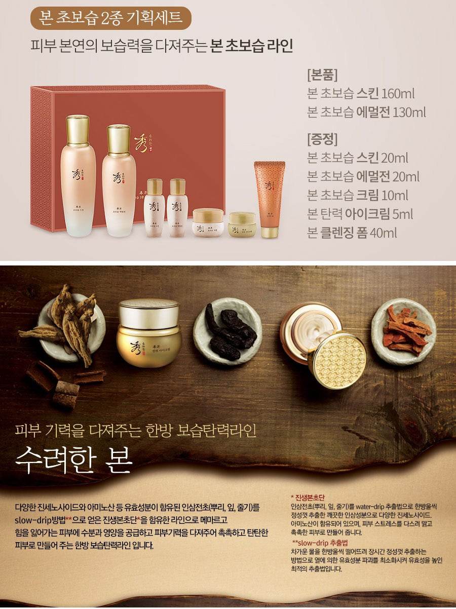 مجموعة من العناية بالبشرة مرطبة وتغذية بعمق ، Sooryehan Bon Ultra ترطيب مجموعة خاصة صاغ مع المستخلصات العشبية الشرقية ، الجينسنغ ، وحمض الهيالورونيك لتقديم رطوبة مكثفة وتحسين مرونة الجلد. تساعد هذه المجموعة على استعادة التوهج الطبيعي للجلد ، وتقوية حاجز الجلد ، وتوفير ترطيب طويل الأمد لعملية بشرة ممتلئة بالشباب.