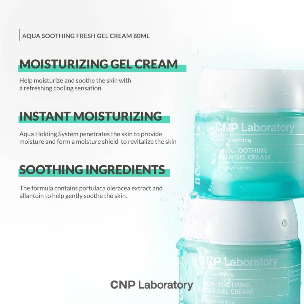 CNP Aqua Soothing Fresh Gel Cream is a lightweight, refreshing gel cream that provides instant hydration while soothing and cooling the skin. Infused with Centella Asiatica and Hyaluronic Acid, it calms irritation, strengthens the skin barrier, and keeps the skin plump and moisturized without a greasy feel.