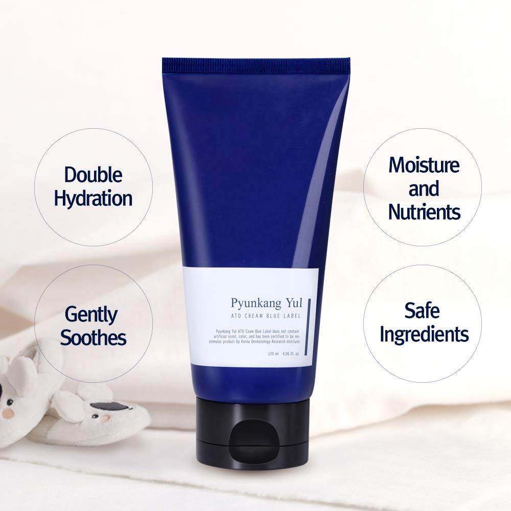 Pyunkang Yul Ato Cream Blue Label is a deeply moisturizing and soothing cream formulated to strengthen the skin barrier and provide long-lasting hydration. Infused with Ceramide NP, Hyaluronic Acid, and Shea Butter, it helps protect sensitive and dry skin while keeping it soft and nourished.
