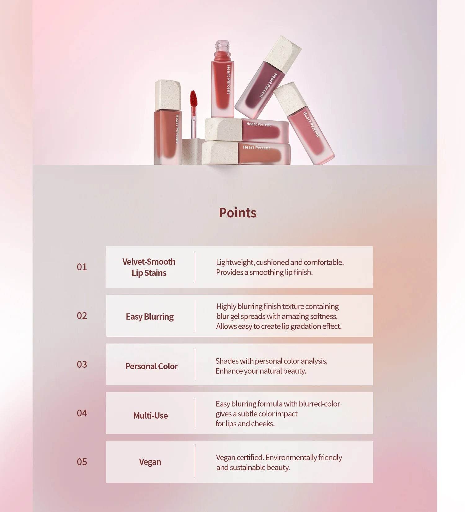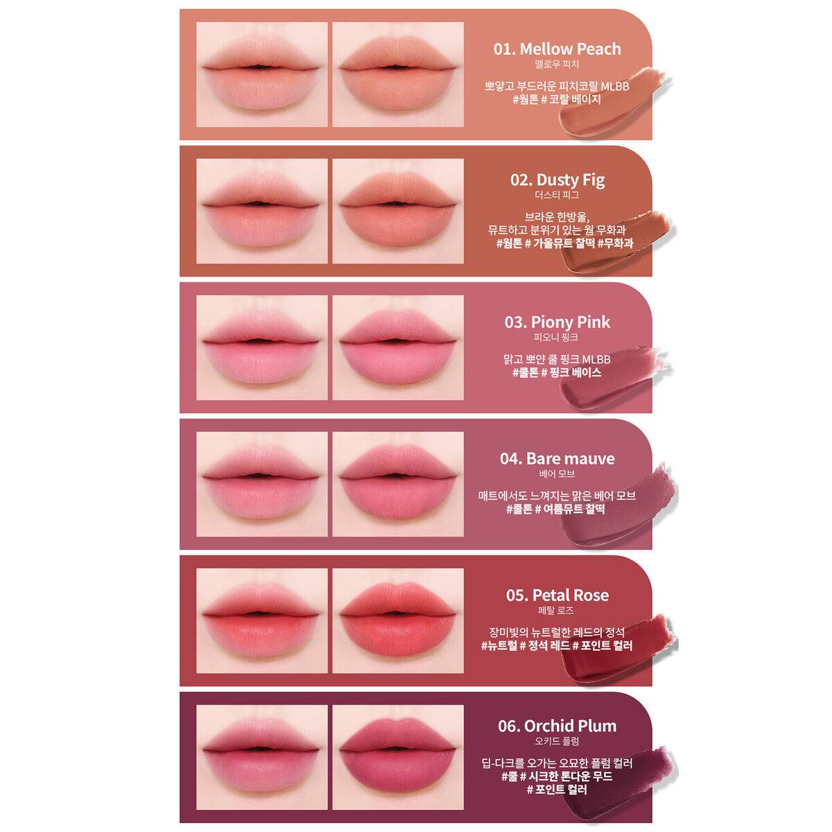 Lehký, vzdušný odstín na rty, který přináší měkký zaostření, rozmazaný efekt se sametovým matným povrchem. Hladká textura podobná pěny bez námahy klouže a vytváří přirozený, rozptýlený vzhled rtů a udržuje rty pohodlné a hydratované.