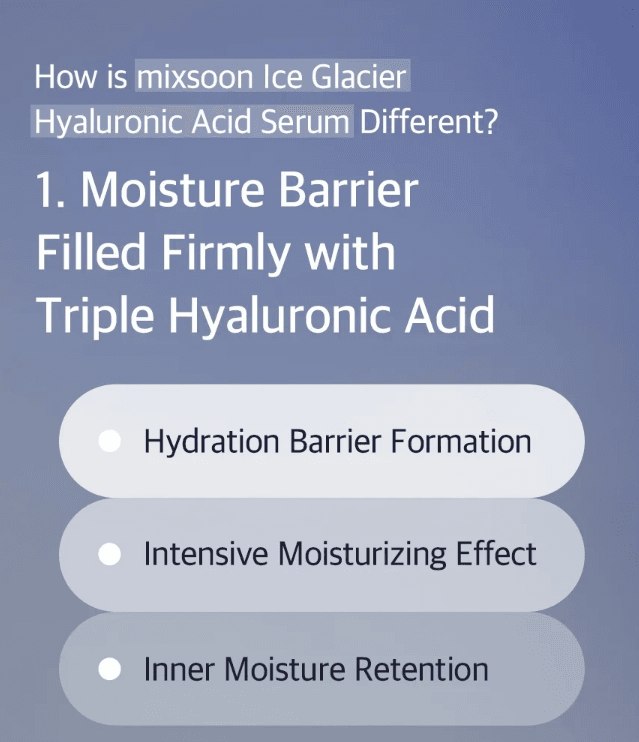 Sérum kyseliny hyaluronové v ledovce Mixsoon je a hluboce hydratační sérum naplněn Ledovcová voda a kyselina hyaluronová Pro dodávání dlouhodobé vlhkosti a zvýšení elasticity pokožky. Tento lehký, rychle poprvé vzorec pomáhá baculací pokožku při zachování čerstvé, orosené záře.