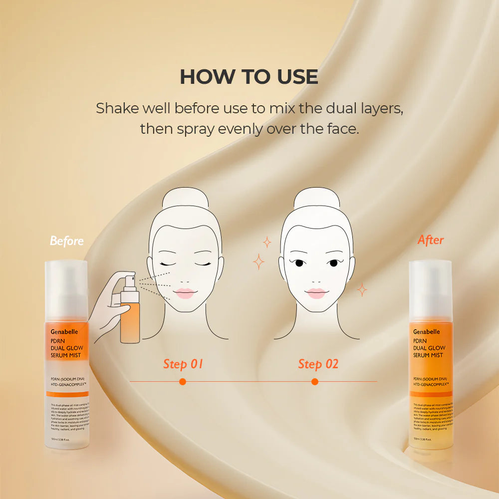 Genabelle - PDRN Dual Glow Serum Mist 100ml revitalizes the skin with a nourishing formula designed to enhance radiance and hydration. Infused with PDRN, this serum mist promotes skin regeneration while providing a refreshing glow. Its lightweight composition ensures easy absorption, leaving the skin feeling smooth and rejuvenated.