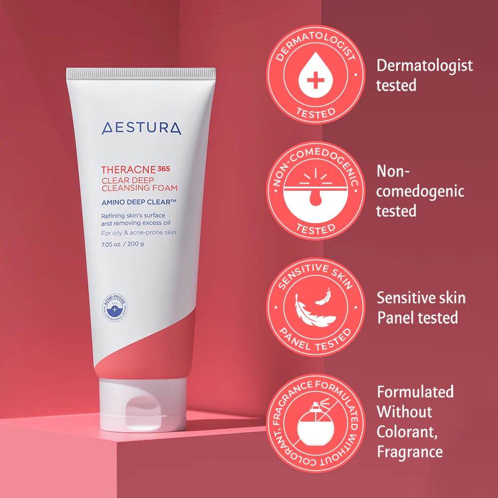 Aestura Theracne Clear Deep Nettoying mousse est un nettoyant pour le visage testé par un dermatologue conçu pour nettoyer profondément les pores, éliminer l'excès d'huile et prévenir les éruptions. Infusé d'ingrédients apaisants et combattant l'acné, il purifie efficacement la peau tout en maintenant l'équilibre de l'humidité pour un teint clair et rafraîchi.
