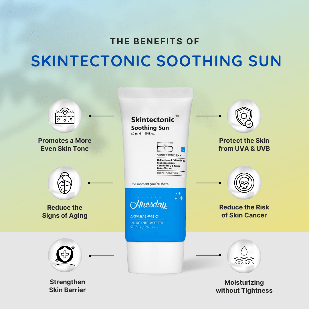 11uesday - Skintectonic Soothing Sun SPF50+ PA++++ 50ml offre une protection solaire de haut niveau tout en apaisant et hydratant la peau. Avec sa formule légère, il s'absorbe facilement sans laisser de résidu gras, ce qui le rend idéal pour une utilisation quotidienne. Infusé d'ingrédients apaisants, le produit aide à réduire les rougeurs et les irritations, favorisant un teint équilibré même sous un soleil intense.