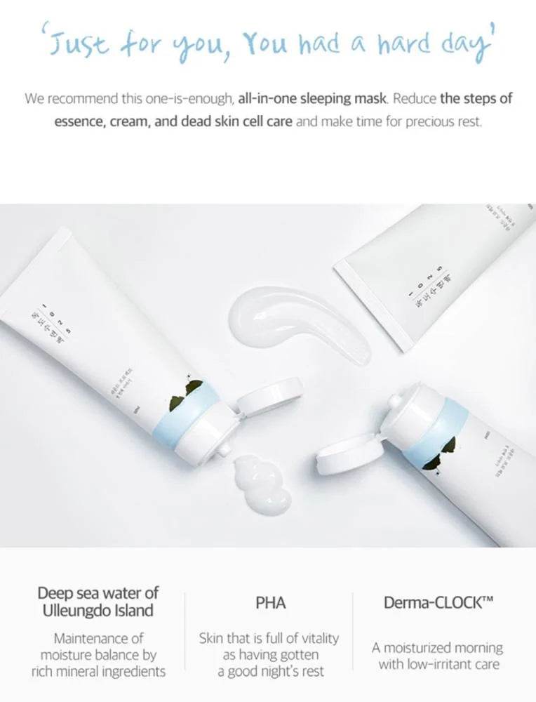 Masc taise thar oíche saibhir le huisce domhain farraige ó Oileán Dokdo chun taise a athlíonadh, an craiceann a shíocháint, agus bacainn an chraicinn a neartú. Glacann an uigeacht gile éadrom go héasca, ag fágáil an chraicinn bog, plump, agus athnuaite faoi mhaidin.