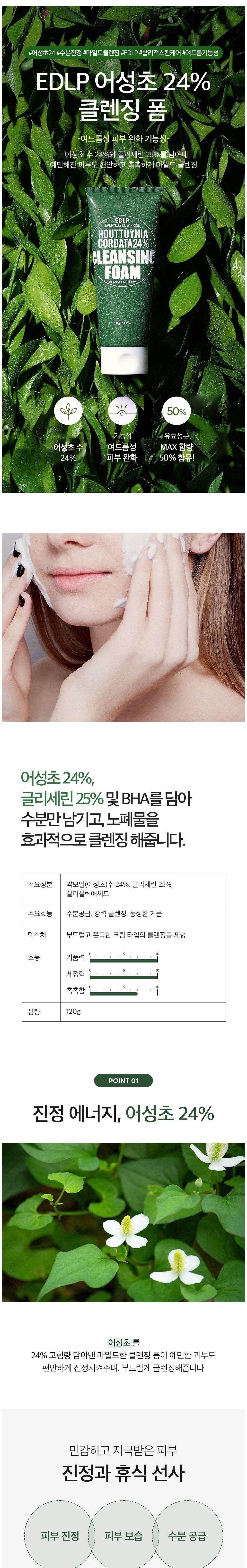Derma Factory - ドクダミエキス24% クレンジングフォーム 120ml は、ドクダミエキスの鎮静効果を利用して、肌を深く洗浄し浄化します。やさしく不純物や余分な皮脂を取り除き、肌の自然なバランスを保ちながらさっぱりと洗い上げるため、毎日の使用に適しています。