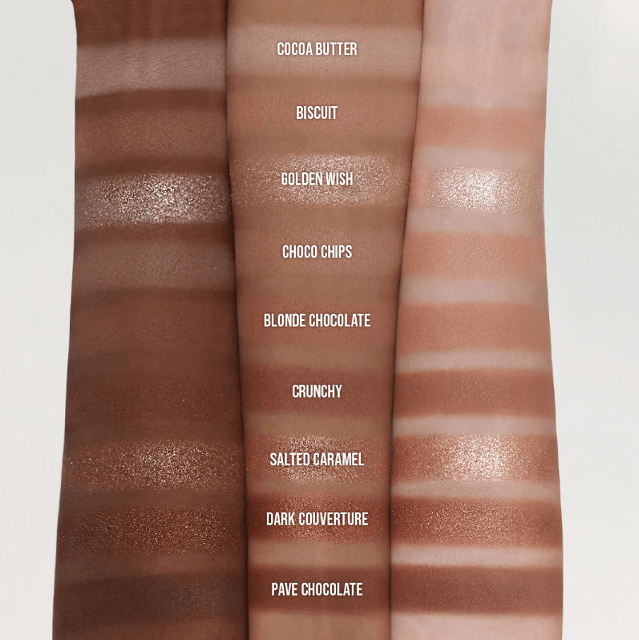 **チョコチップ**:マイカ(CI 77019)、タルク、二酸化チタン(CI 77891)、ホウケイ酸(Ca/Al)、ナイロン-12、シリカ、ミリスチン酸Mg、ネオペンチルグリコールジエチルヘキサノエート、フェニルトリメチコン、酸化鉄(CI 77491)、ホウケイ酸(Ca/Na)、銀(CI 77820)、酸化鉄(CI 77492)、ジペンタエリスリチルヘキサヒドロキシステアレート/ヘキサステアレート/ヘキサロジン酸、ジメチコン、ステアリン酸Mg、メチルプロパンジオール、リンゴ酸ジイソステアリル、ネオペンタン酸イソステアリル、ステアロイルステアリン酸オクチルドデシル、マカダミアナッツ油、酸化鉄(CI 77499)、ジメチコン/ビニルジメチコンクロスポリマー、プロパンジオール、ポリブテン、イエロー5レーキ(CI 19140)、ラウロイルリジン、トリエトキシカプリリルシラン、水酸化アルミニウム、水素化レシチン、メチコン、レッド30(CI 73360)、酸化スズ(CI 77861)、水。
