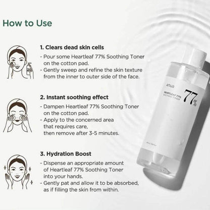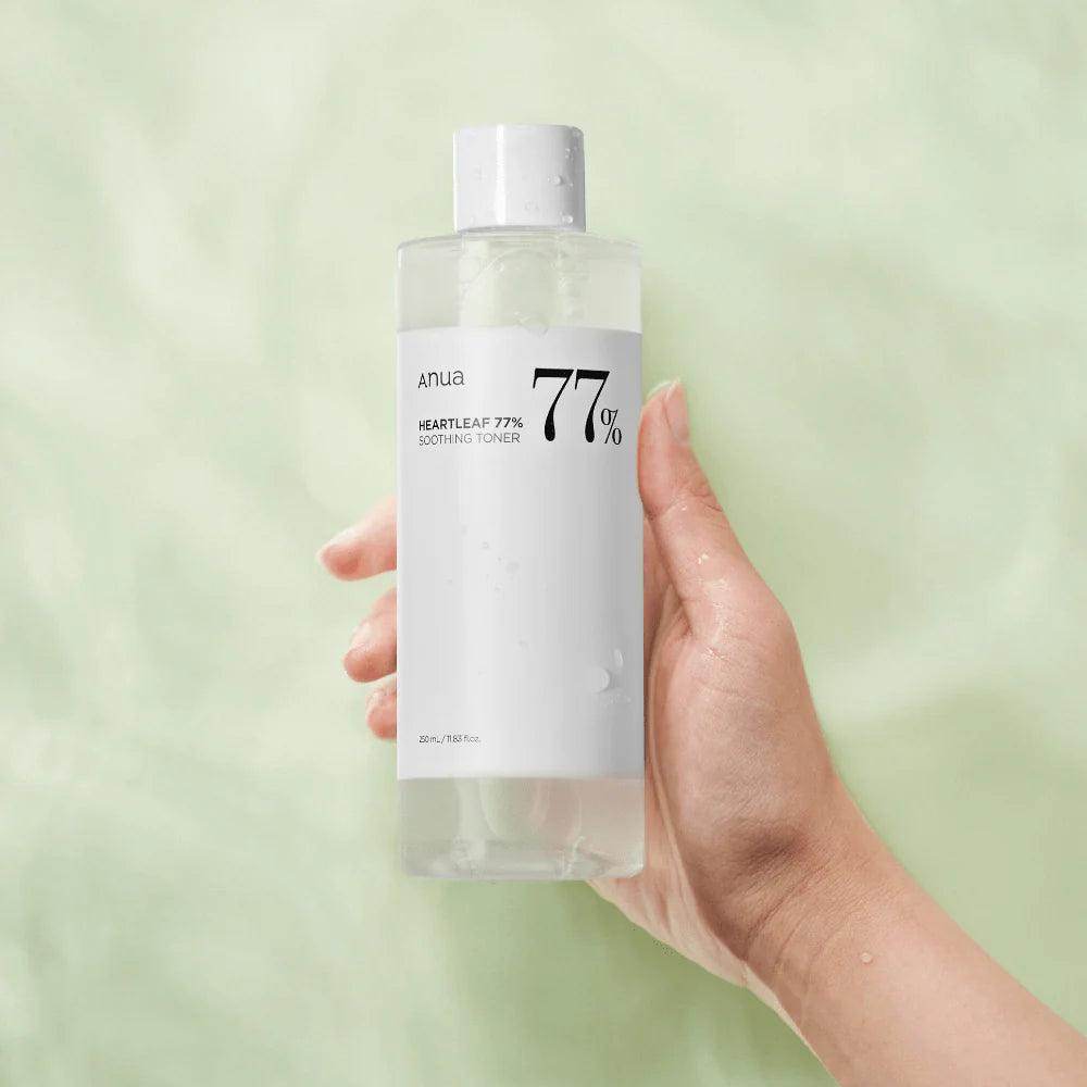 Anua Heartleaf 77% Soothing Toner is a calming and hydrating toner formulated with 77% Heartleaf extract, known for its anti-inflammatory and soothing properties. This toner is designed to gently balance the skin's pH, reduce redness, and soothe irritation while providing essential hydration.