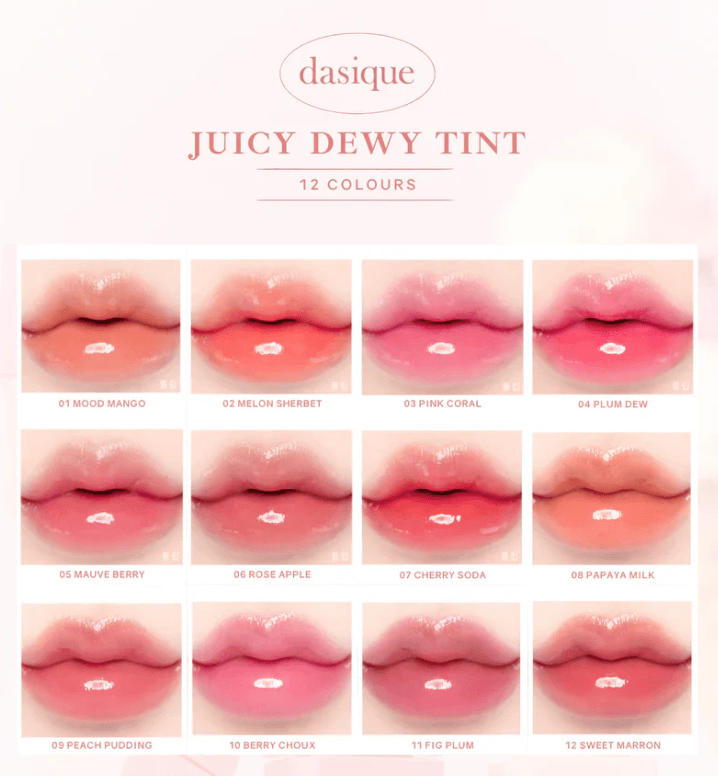 Experience vibrant color and a luscious finish with Dasique - Juicy Dewy Tint Fruit Color - 15 Colors. This versatile lip tint delivers a burst of fruity shades that enhance your natural beauty while providing a dewy, fresh look. Perfect for everyday wear, these tints glide on smoothly for a subtle yet stunning effect, making them a must-have addition to your makeup collection.