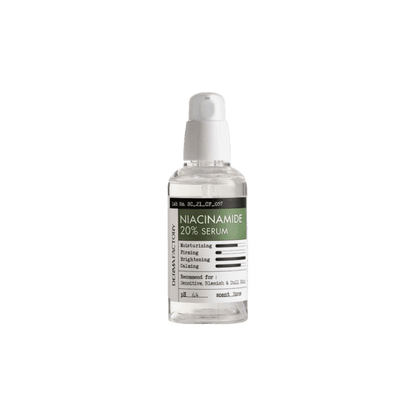 Derma Factory potent serum formulated with 20% niacinamide to target multiple skin concerns such as enlarged pores, excess oil, uneven skin tone, and hyperpigmentation. This high-strength formula helps brighten the complexion, reduce the appearance of dark spots, and refine skin texture, leaving the skin clearer, smoother, and more radiant.