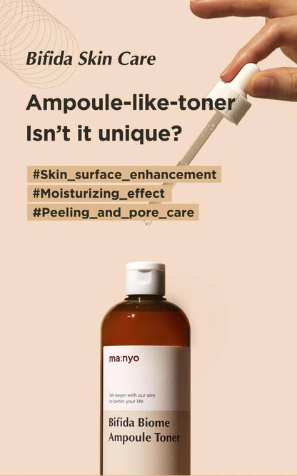 Manyo Bifida Biome Ampoule Toner is a hydrating and restorative toner designed to improve the skin’s moisture barrier and strengthen its natural defenses. Formulated with Bifida Ferment Lysate, a probiotic ingredient known for its skin-repairing properties, this toner helps soothe, hydrate, and improve skin elasticity. Its lightweight texture absorbs quickly, leaving the skin refreshed and revitalized.