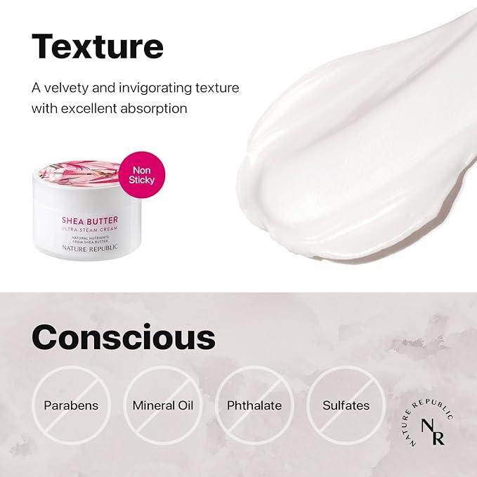 Experience the luxurious hydration of Nature Republic - Shea Butter Ultra Steam Cream 100ml. This rich and creamy moisturizer is formulated with natural shea butter, providing deep nourishment and a silky texture that melts effortlessly into your skin. Ideal for daily use, this cream is designed to deliver intense moisture while promoting a healthy, radiant complexion.