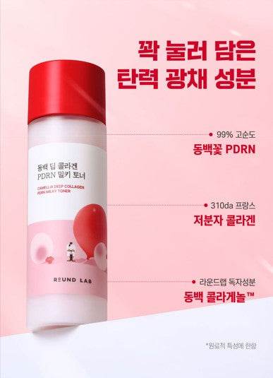 Round Lab - Camellia Deep Collagen PDRN Milky Toner 150ml är en återfuktande toner berikad med kameliaextrakt och PDRN, utformad för att djupt återfukta och stärka hudens naturliga barriär. Dess mjölkiga textur hjälper till att tillföra viktiga näringsämnen och främja kollagenproduktionen, vilket lämnar huden fyllig och revitaliserad.