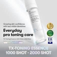 VT - TX Toning Essence 1000 Shot är en kraftfull ljusnande och lugnande essens utformad för att jämna ut hudtonen och förbättra hudens klarhet. Berikad med TX (Tranexamsyra) Komplex, hjälper den till att minska synligheten av mörka fläckar, rodnad och pigmentering samtidigt som den ger djup återfuktning för en strålande, balanserad hy.